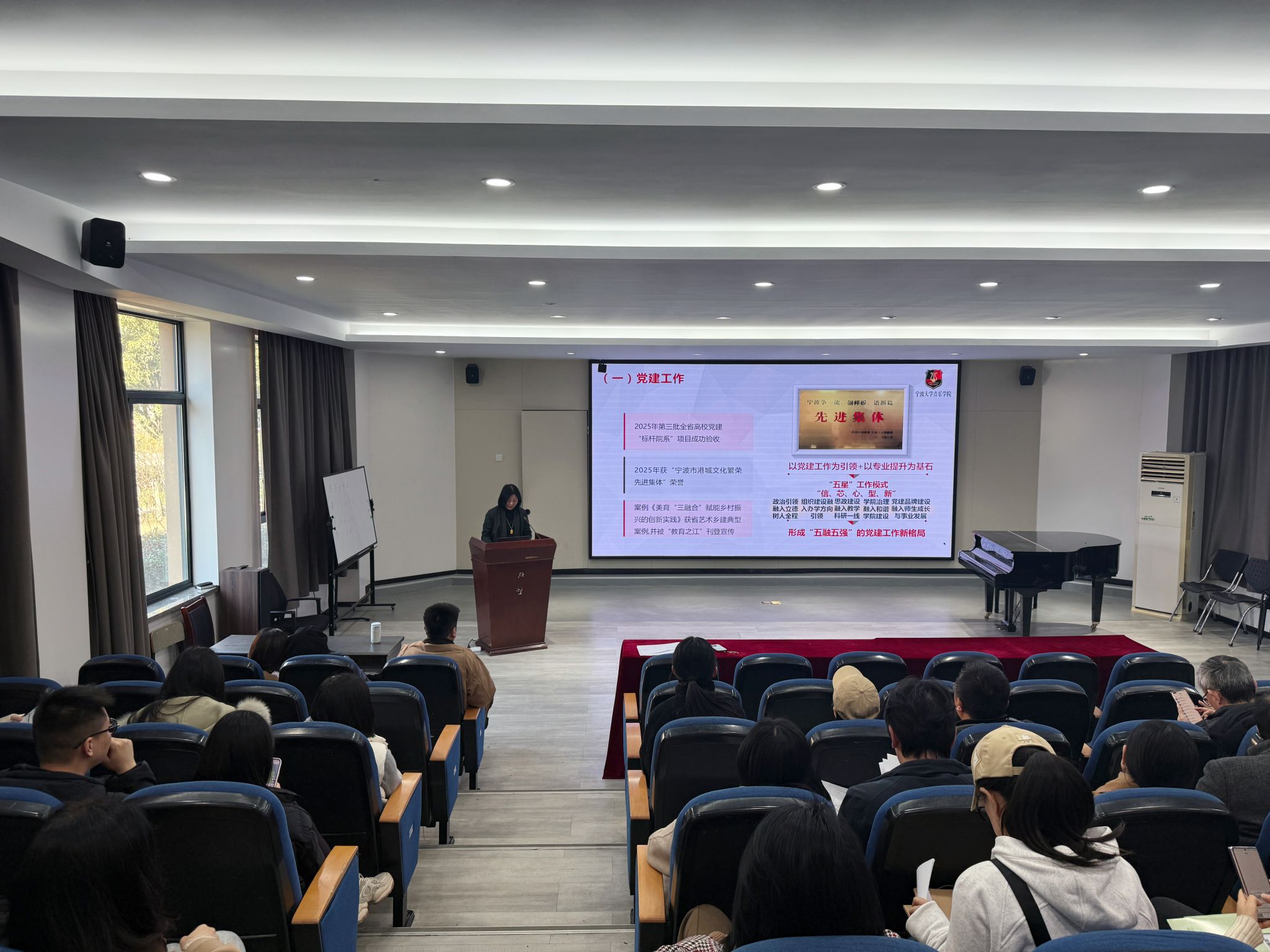 2026年1月14日下午,在学院101阶梯教室举行了司机社 述职大会暨全院教职工大会。院党委书记孔晓虹做了2025年学院工作述职报告,并对学院未来发展规划,学院目标任务,教师工作等方面提出要求。副院长王蕾,刘畅分别就教学、教师教学、科研、研究生工作方面进行了工作总结,并提出新学期工作要求。实验室负责教师就琴房使用等实验室违规行为进行了通报。最后孔书记进行总结,希望全体教职员工在假期,不懈怠不放松,深刻反思,为新学期各项工作做好充分准备!