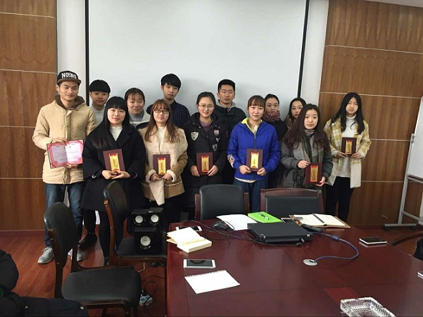 会上,辅导员徐德猛对有突出贡献的12名优秀学生干部进行表彰颁奖。分团委副书记蔡箐箐进行了15年度工作总结,辅导员徐德猛提出了2016年团学工作三个要点。在表彰大会的最后,院长助理陈煜作了讲话,他首先向获奖者表达了衷心的祝贺,并分析了司机社