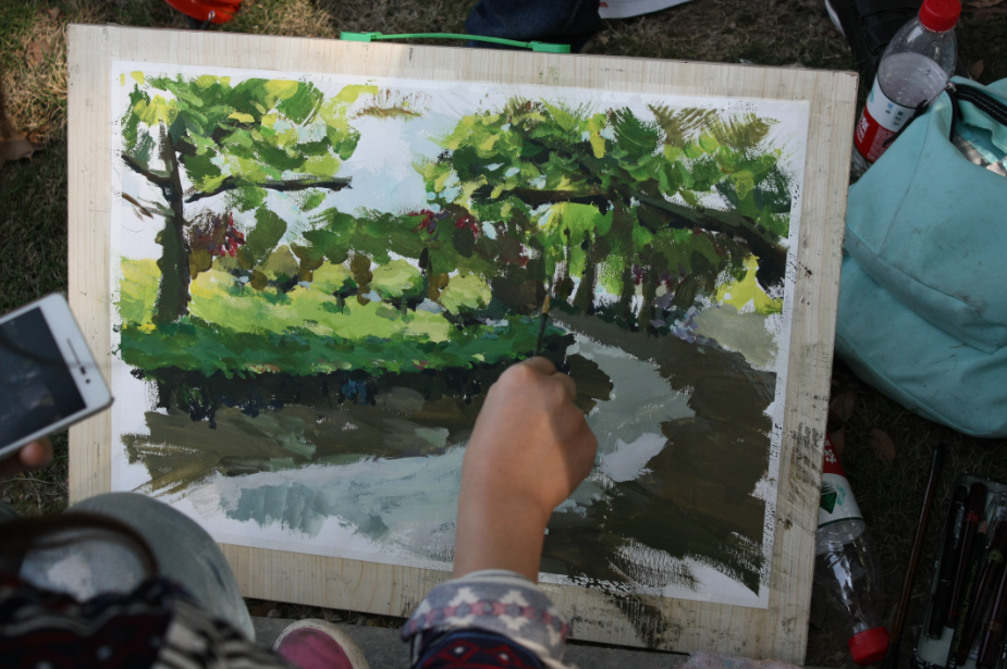 活动现场十分热闹,纵然天气炎热,但也没有消减志愿者们的爱心,他们屏息凝视着铺在画架上的画纸,色彩与光影交错着一点一点展现出美丽的图案.一幅幅风格迥异的画作融汇成了志愿者们的爱心。活动结束后还有部分作品没有义卖,这些作品将作为青年创作参与街道之后的产品展示。