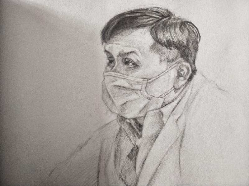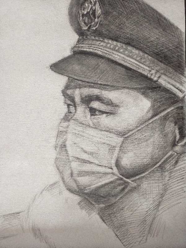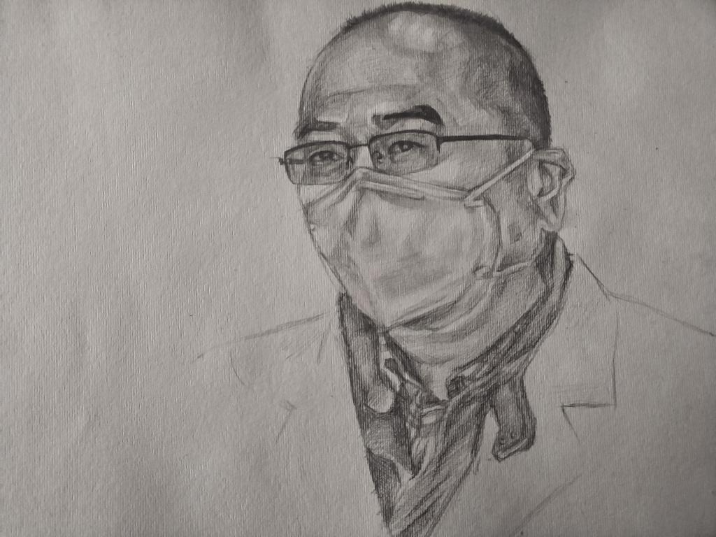 大三同学杨子健十分热爱文艺,无论是在音乐会、音乐剧等各类演出中都能看到他的身影,特别是在原创音乐剧《初心晨启·宣言》中,由他扮演的张人亚父亲张爵谦给大家留下了深刻的印象。疫情期间,杨子健正在湖北老家,他亲眼目睹了白衣天使们守卫人民健康而英勇奋斗的场景,他心潮澎湃,激励发了创作激情,不仅在《天使真爱》中用高亢的歌声表达着自己的情感,同时也用自己的画笔,绘就了“抗疫英雄谱”,他说:“我永远忘不了那一双双坚定而又充满力量的眼睛,向抗疫英雄们致敬!”
