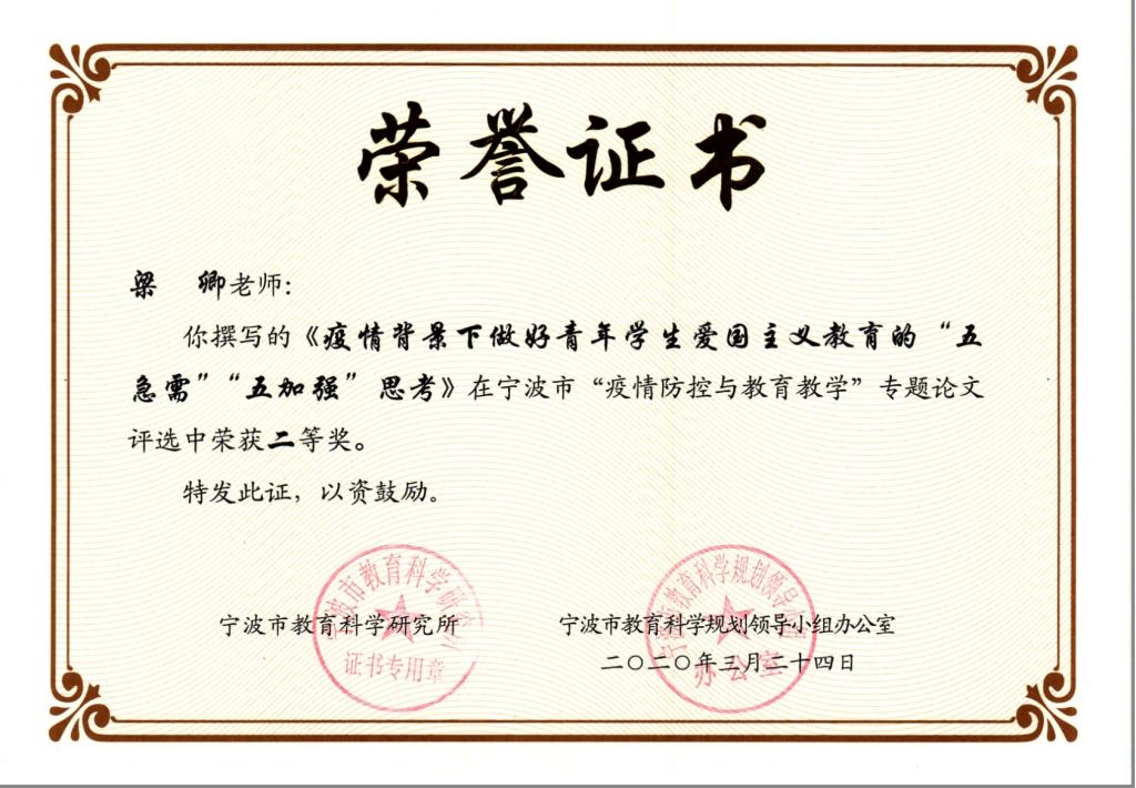 本课题的政策建议报告《疫情背景下做好青年学生爱国主义教育的“五急需”“五加强”思考》分获十三届全国政协副主席邵鸿同志与浙江省委副书记、宁波市委书记郑栅洁同志的肯定性重要批示,同名论文获得宁波市“疫情防控与教育教学”专题论文征集评选二等奖。