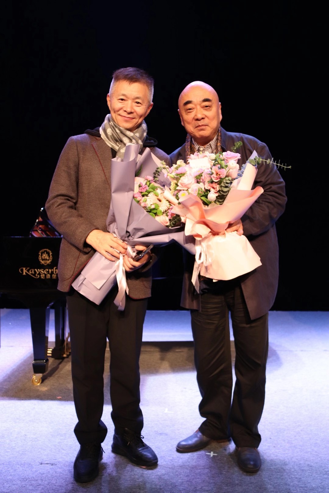 侯攀老师的钢琴声如流水般缓缓流淌,江南景色跃然而生。之后,钱树林带来了歌曲《大河涨水沙浪沙》和《走进香巴拉》,陈思里演唱了《格桑梅朵》和《月光光》。王宏伟老师则带来了一首来自家乡的维吾尔族民歌《阿瓦尔古丽》和歌剧《尘埃落定》选段《情话》,深情的演唱掀起了音乐会的第一个高潮。随后,杜朋朋带来了歌曲《黄河船夫曲》和《新女婿拜丈人》。随后,王宏伟老师换上剧装深情演绎黄继光,唱响纪念抗美援朝的红色题材经典歌剧《同心结》选段《抬头仰望夜黑的天》,将音乐会带入第二个高潮。接着,郝亮亮演唱了《送饭调》和《叫声妹妹泪莫流》。观众雷鸣般掌声久久不散,王宏伟老师又带领他的学生们加演了《天路》和他的成名作《西部放歌》,音乐会在《西部放歌》熟悉的旋律中伴随着观众依依不舍的掌声落下帷幕。