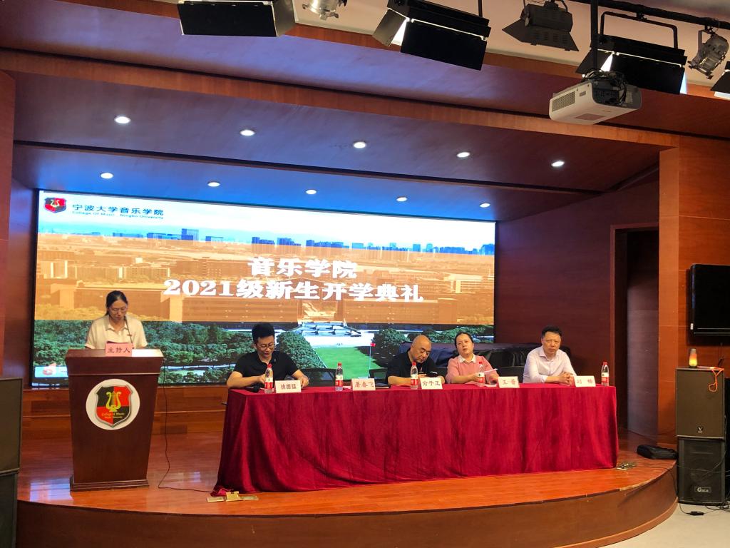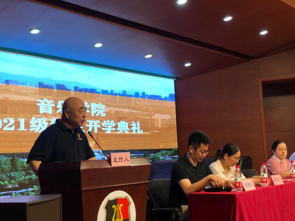 2021级新生开学典礼在西区小音乐厅顺利举行,院长俞子正、院党总支书记屠春飞、副院长王蕾、刘畅,新生班班主任出席,会议由学生工作负责人徐德猛主持。