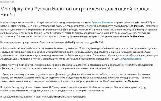 伊尔库茨克市对此次宁波市代表团访问活动进行了新闻报导