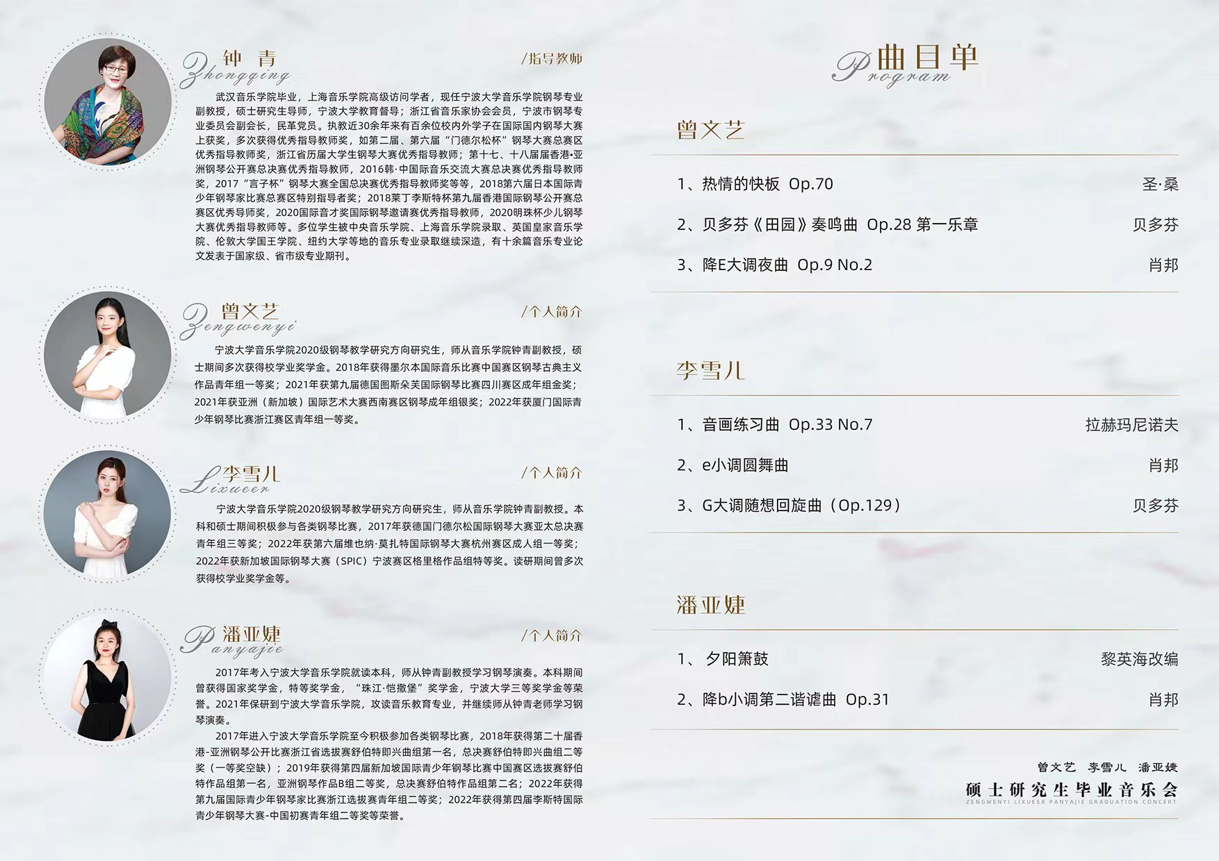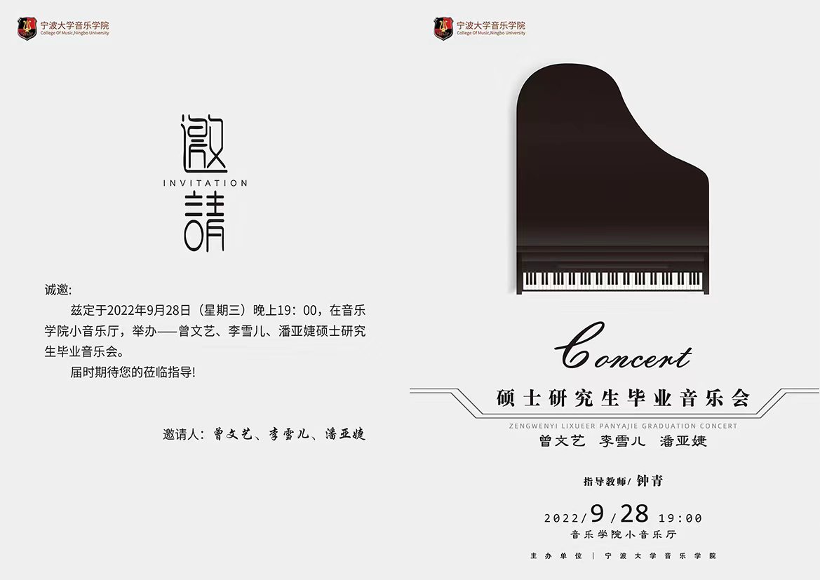 司机社 20级音乐与舞蹈学专业钢琴教学研究方向曾文艺、李雪儿将于2022年9月28日于西区小音乐厅举行专场音乐会,欢迎大家前来聆听!
