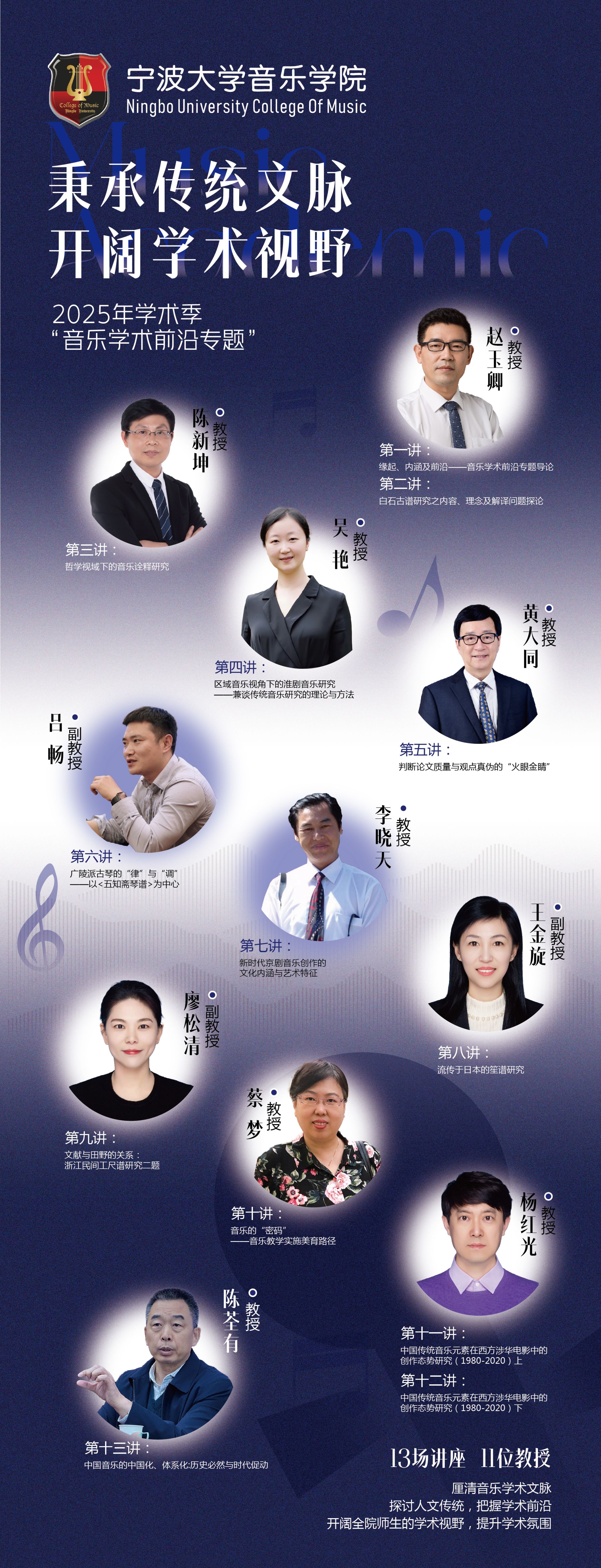 为进一步秉承传统文脉,弘扬音乐文化,学院以研究生“音乐学术前沿专题”课程为依托,2025年推出《“学术季”——音乐学术前沿专题》,邀请全国著名学人及音乐界翘楚,对音乐学术前沿作专题讲座,厘清音乐学术文脉,探讨人文传统,把握学术前沿。