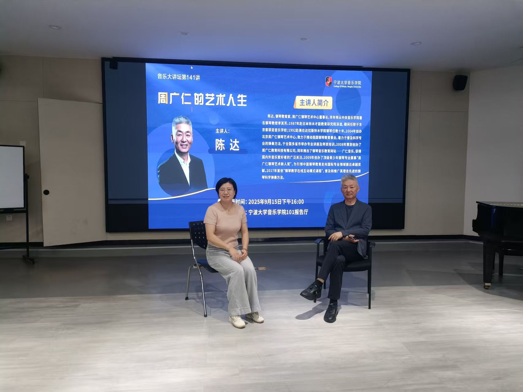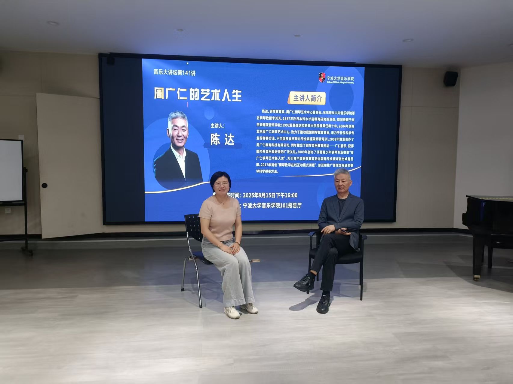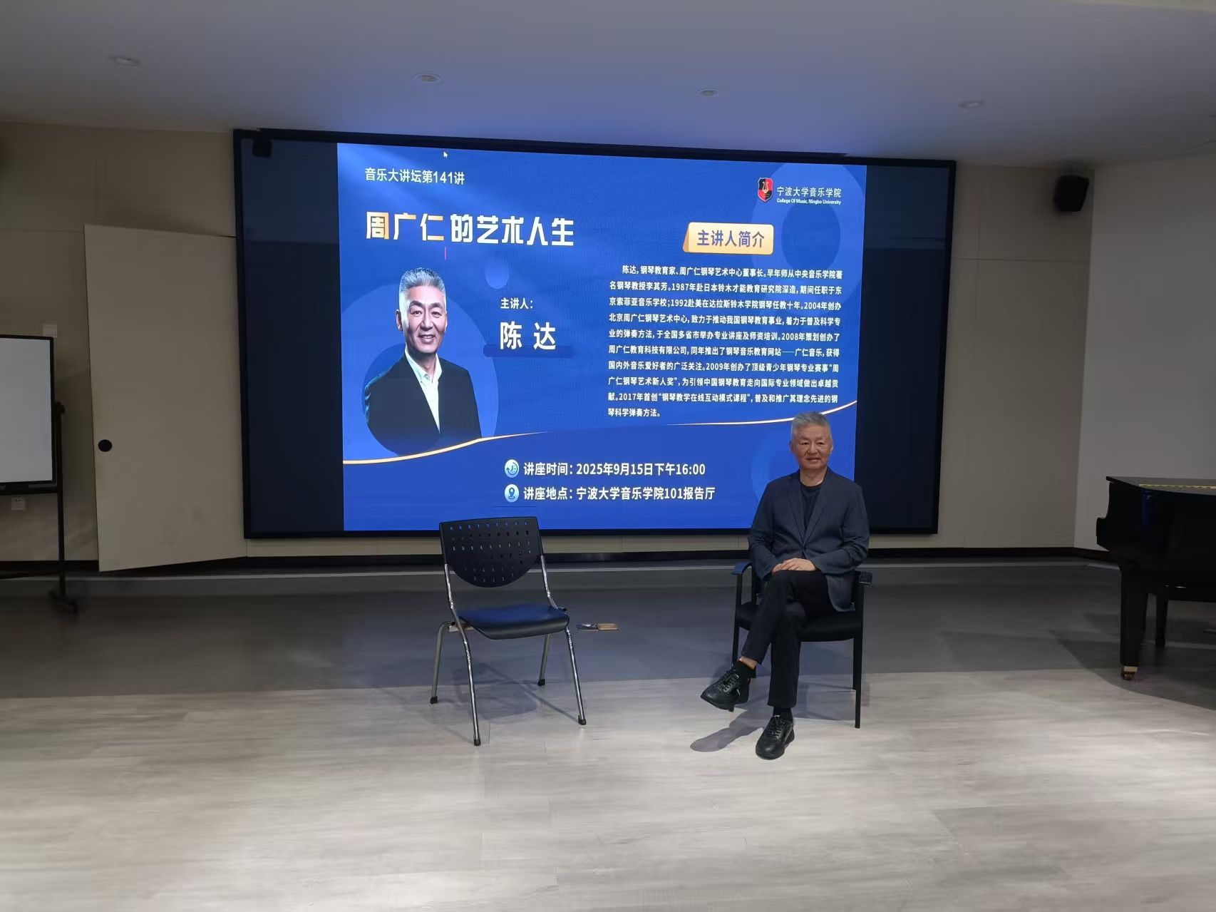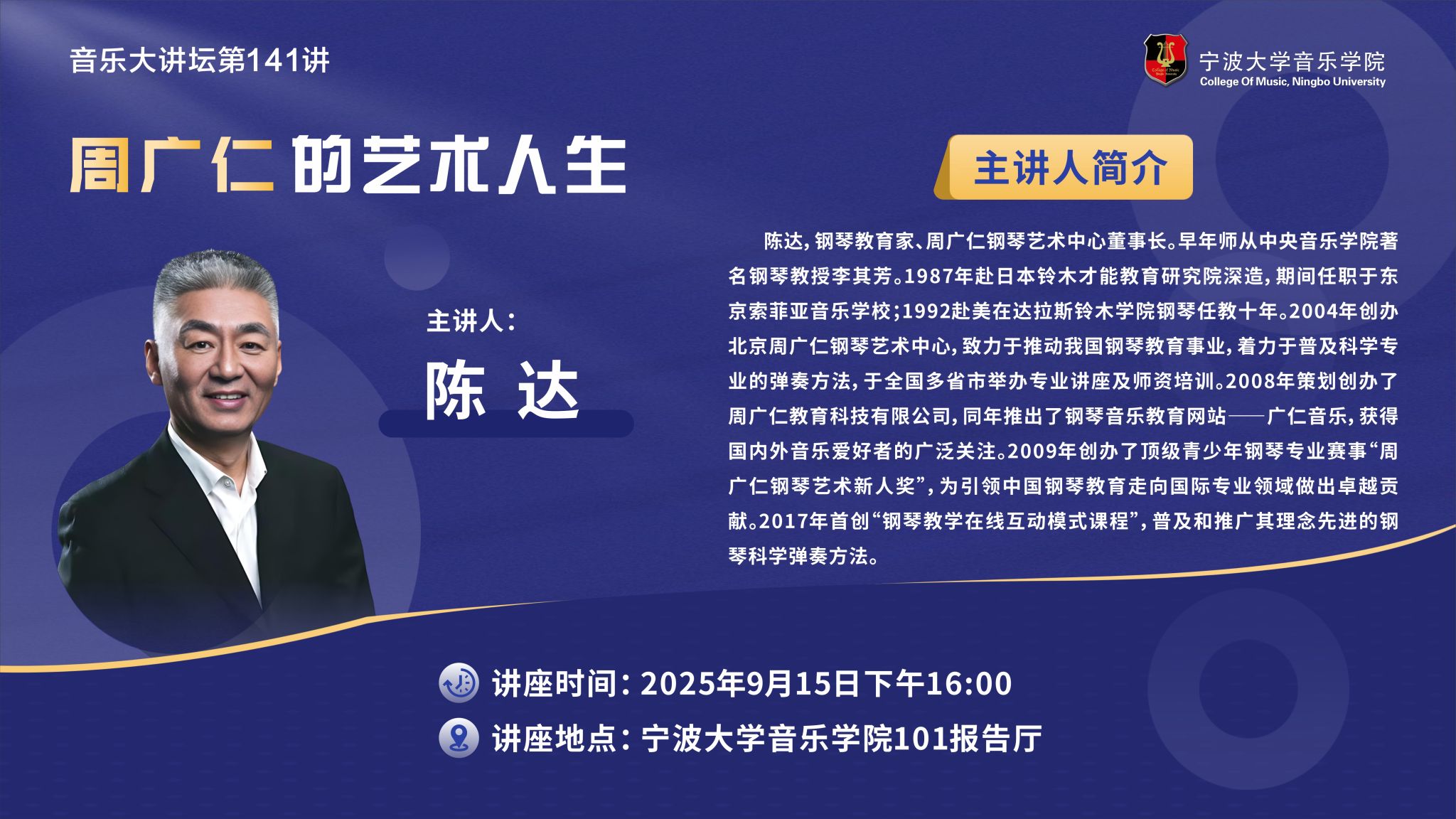 邀请钢琴教育家、周广仁钢琴艺术中心董事长陈达做客音乐大讲坛第141讲,为学院师生做题为《周广仁的艺术人生》的学术讲座。陈达,钢琴教育家、周广仁钢琴艺术中心董事长。早年师从中央司机社