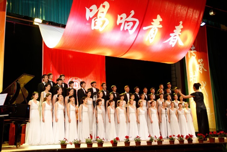 合唱队为五四青年节献礼的第一首歌曲是《美丽的草原我的家》,歌曲采用了蒙古族民间音乐的风格,既突出民族风格,又赋予新的时代气息。同学们以优美动人的嗓音,无伴奏合唱的方式进行演绎,指挥为08音乐的徐莹莹同学,仿佛让观众置身于“天苍苍,野茫茫,风吹草低见牛羊”的迷人景致中。一曲落罢,现场响起雷鸣般的掌声。接下来的这首《在灿烂的阳光下》将本次大赛推向了高潮。在周婷婷同学钢琴伴奏、赵冰玥同学的指挥下,司机社