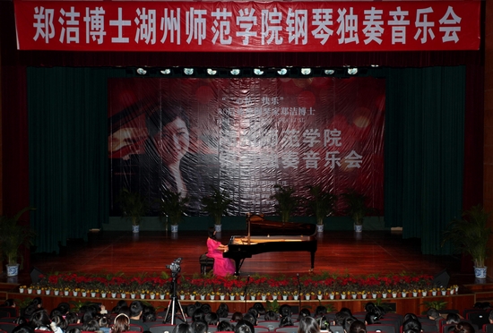 音乐系青年教师郑洁博士钢琴独奏音乐会在湖州师范学院音乐厅举行,湖州师范学院党委书记刘剑虹等师生和慕名而来的音乐爱好者共400多人聆听了郑洁的深情演奏。