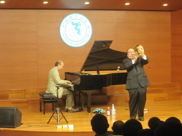 在当晚的爵士音乐会上,美国著名爵士钢琴家博内特·汤普森和长号演奏家汤姆·史密斯联袂为观众献上了一场爵士音乐大餐。他们演奏了《六十六号公路》、《在彩虹上》、《有心计的女人》等美国著名爵士风格歌曲。别具一格的风格让现场观众感受到了清新的气息,精彩的演奏不时博得观众热烈的掌声。