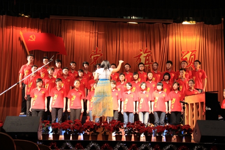 蓝陈军、李健两位同学合作,在短短5分钟的时间内,现场作画《大鹏展翅》、书法《风华正茂》,向党的生日献礼,赢得了观众们的阵阵掌声。最后,校红歌会也带来了大合唱《鼓浪屿之波》,为晚会画上了一个完满的句号。
