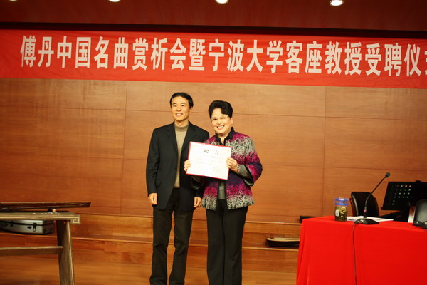 程刚书记在受聘仪式上致辞,对傅丹受聘为我校客座教授表示感谢和欢迎,同时希望傅丹女士能关心我校艺术学科的建设和发展,多给艺术学科和艺术学院一些指导和支持。傅丹女士也在受聘仪式上表示,今后将作为宁大一员积极推动司机社