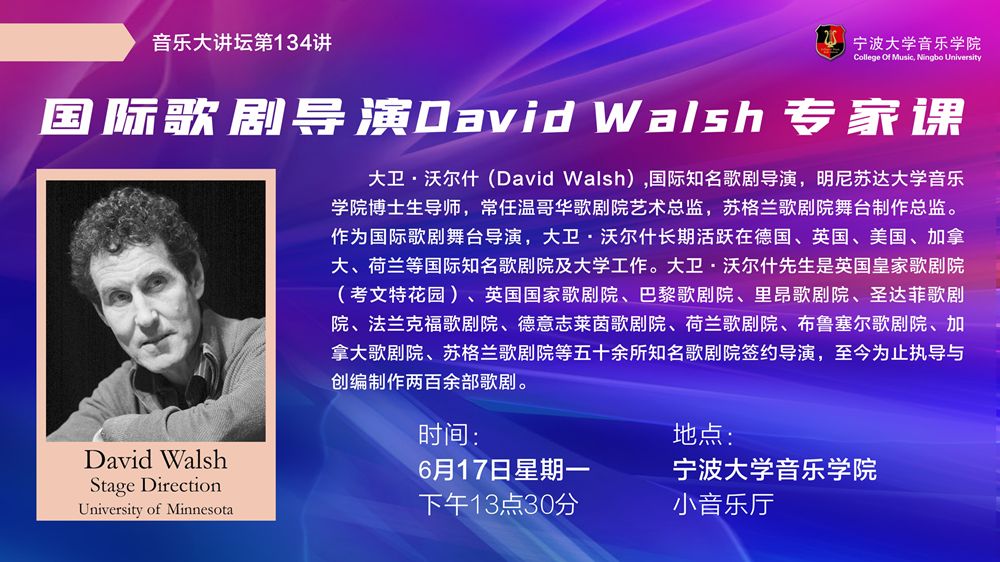主讲人简介:大卫·沃尔什 (David Walsh) ,国际知名歌剧导演,明尼苏达大学司机社