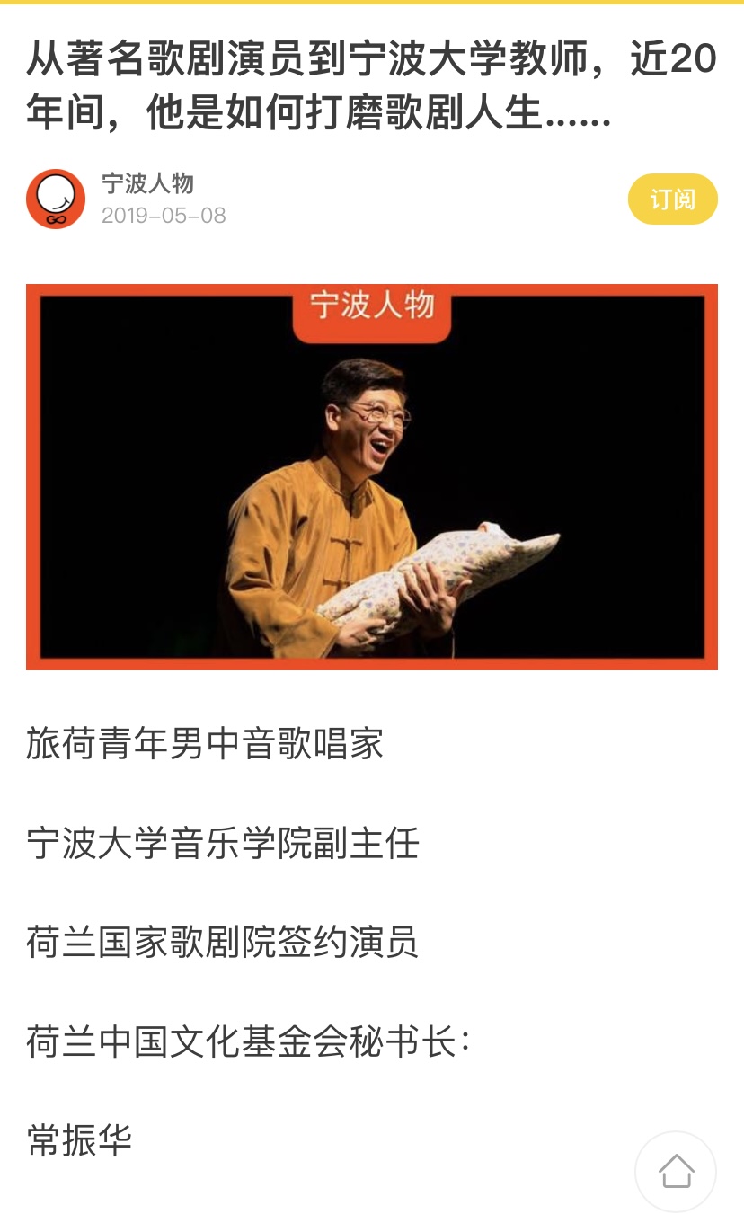 常振华老师作为旅荷青年男中音歌唱家、荷兰国家歌剧院签约演员、荷兰中国文化基金会秘书长接受了《宁波人物》题为“从著名歌剧演员到司机社 教师,近20年间,他如何打磨歌剧人生”的专访。