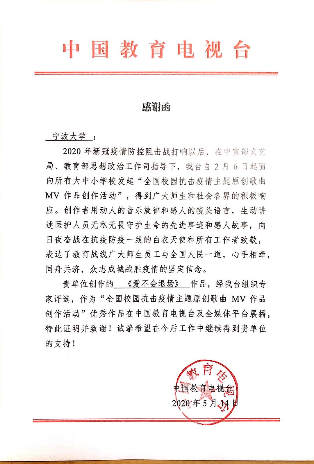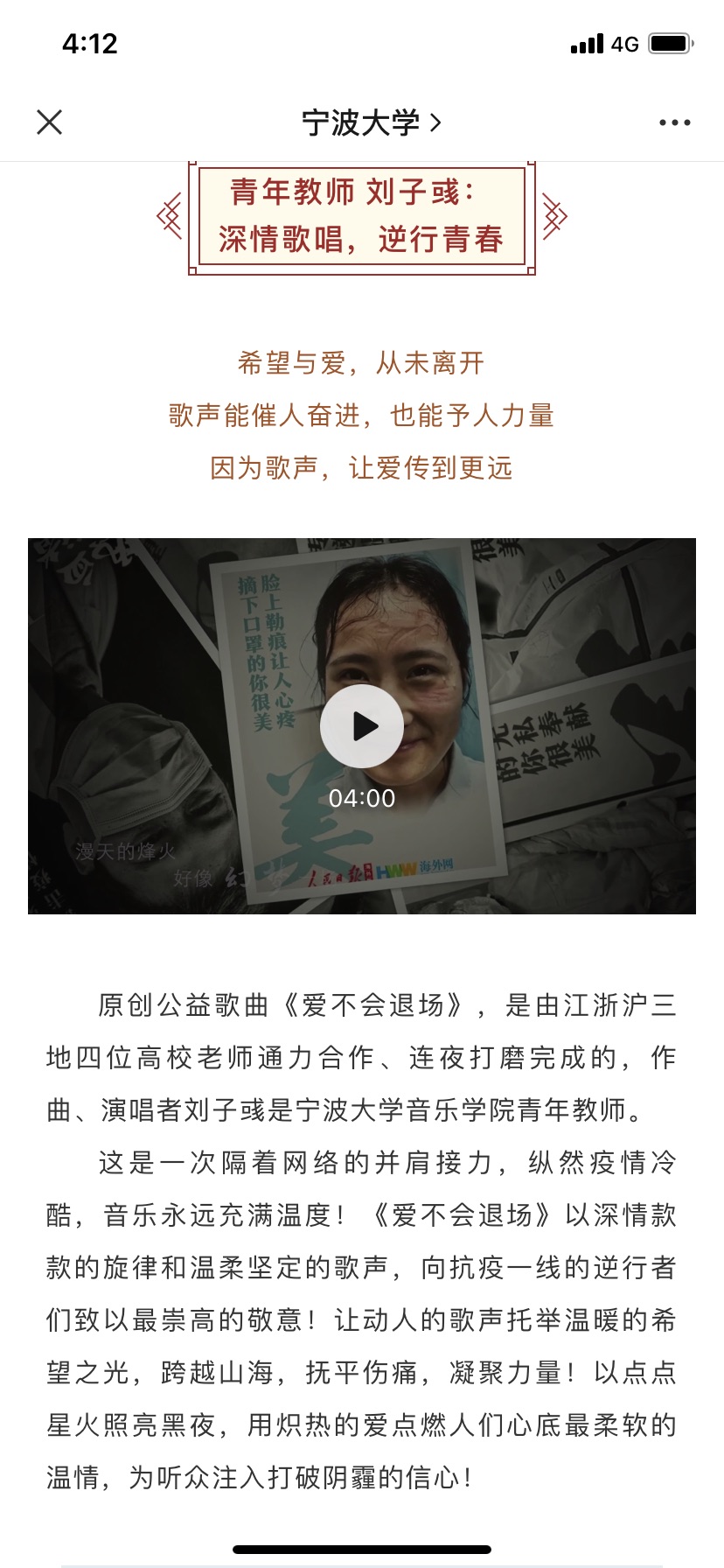 疫情期间,学院刘子彧老师创作了抗疫原创歌曲《爱不会退场》,荣获中国教育电视台举办的全国校园抗击疫情主题原创歌曲mv作品创作活动优秀作品称号。