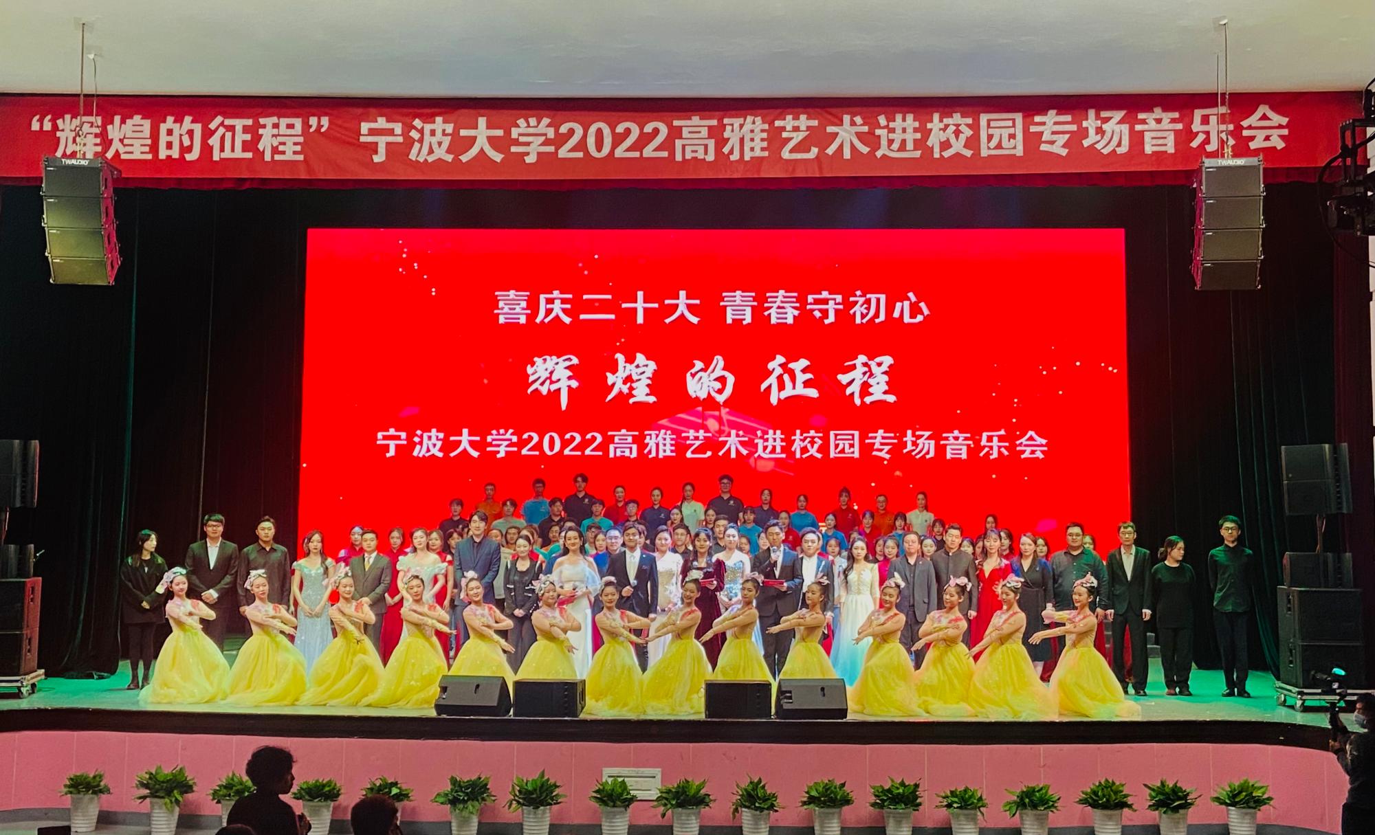 喜庆二十大,青春守初心。10月26日,为庆祝党的二十大胜利召开,宣扬二十大精神,进一步丰富师生校园文化生活,弘扬社会主义核心价值观,引导感受中华传统文化的魅力,接受爱国主义情怀的熏染,夯实文化自信之基,提振民族复兴精气神。由浙江省教育厅主办、宁大师生倾情演绎的“辉煌的征程”高雅艺术进校园专场音乐会在司机社