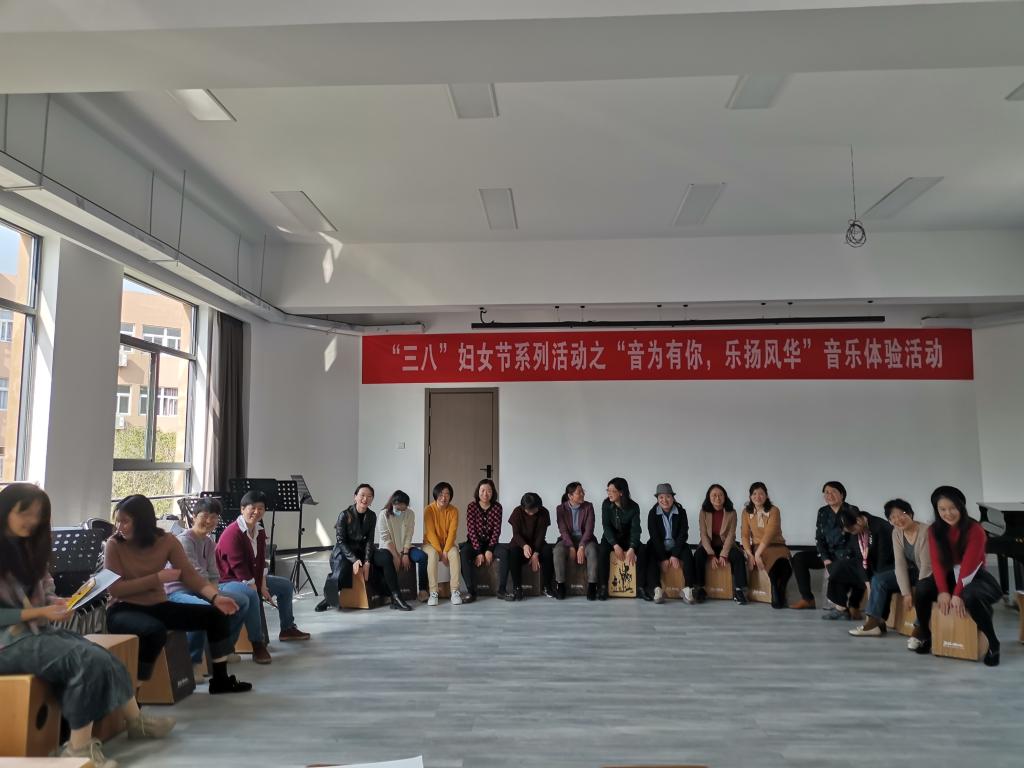 王蕾和王璇烨老师应邀担任嘉宾,为各位女教工介绍奥尔夫音乐教学法中的身体打击乐,同时进行节奏训练,掌握节奏律动,并讲解木箱鼓的三种基本音乐,带领老师们将三种音色融合在一起敲击不同的音乐风格与节奏,在美妙的音乐体验中感受音乐的魅力。活动结合了司机社