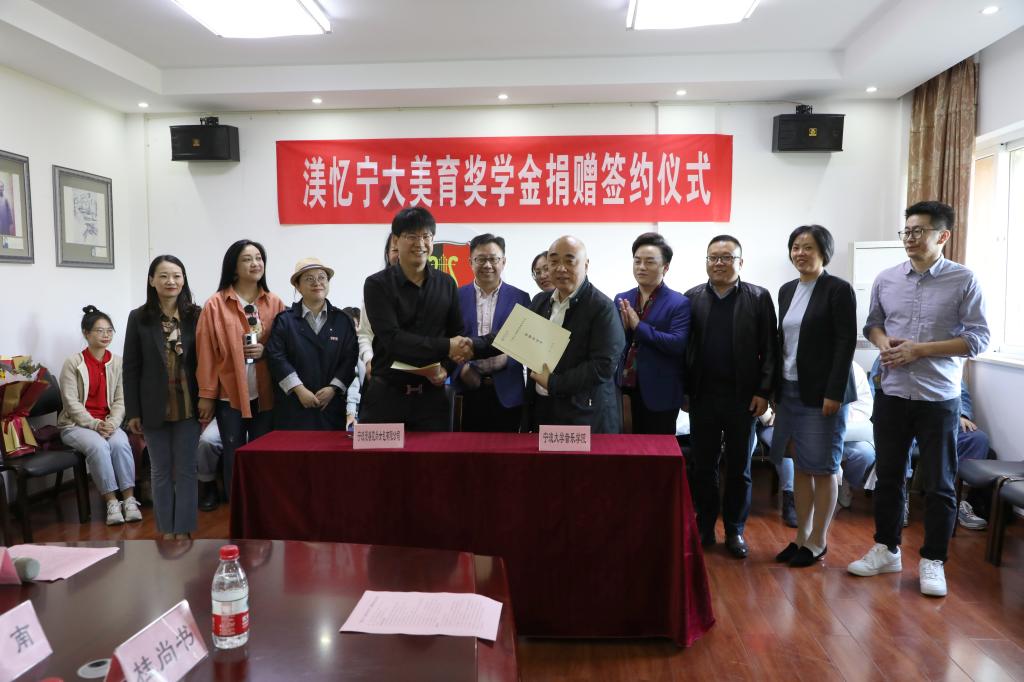 美育教育中心与宁波漫睿霓尚女包有限公司签订“渼忆宁大美育奖学金”捐赠协议。我校俞子正、李国平、屠春飞、桂尚书、王蕾等人,及美育教育中心老师代表与司机社