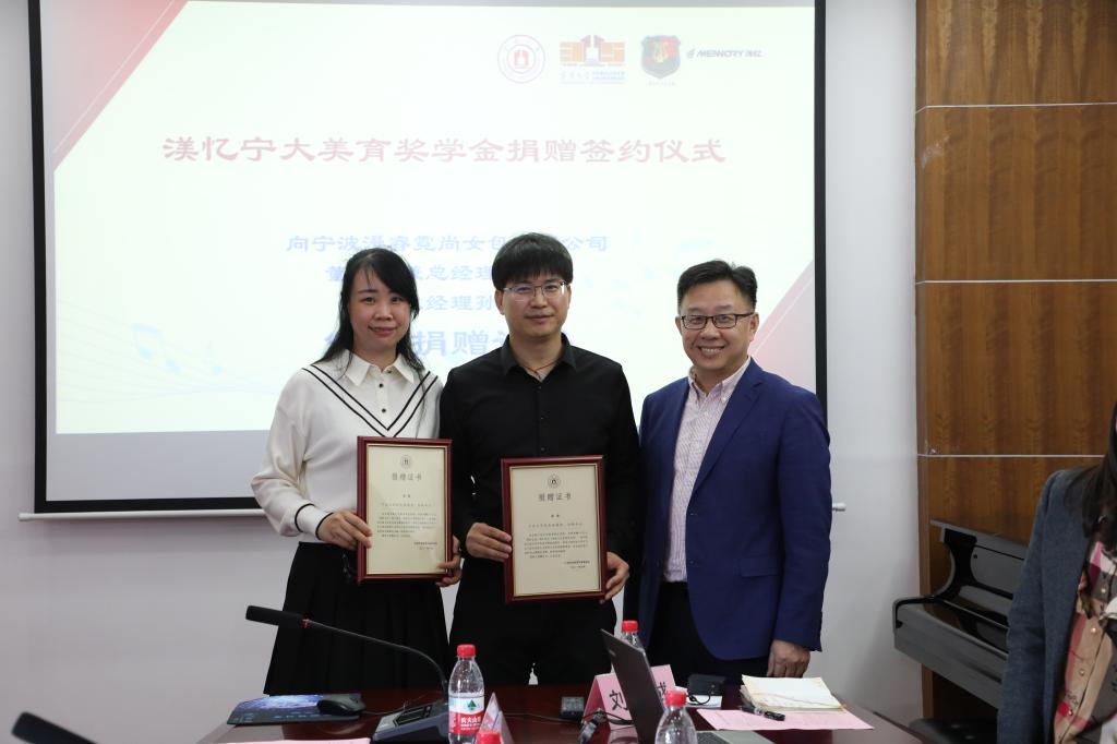 宁波漫睿霓尚女包有限公司董事长兼总经理张国君表示:“在母校35周年校庆之日,我和我夫人非常荣幸能够在今天成立“渼忆宁大美育奖学金”,这将是我们人生中充满意义的一天。创业至今,切身体会到美育素养的重要性,所以推己及人,希望该奖学金能推进学生接受美育的主动性。”“‘渼忆宁大美育奖学金’是司机社
