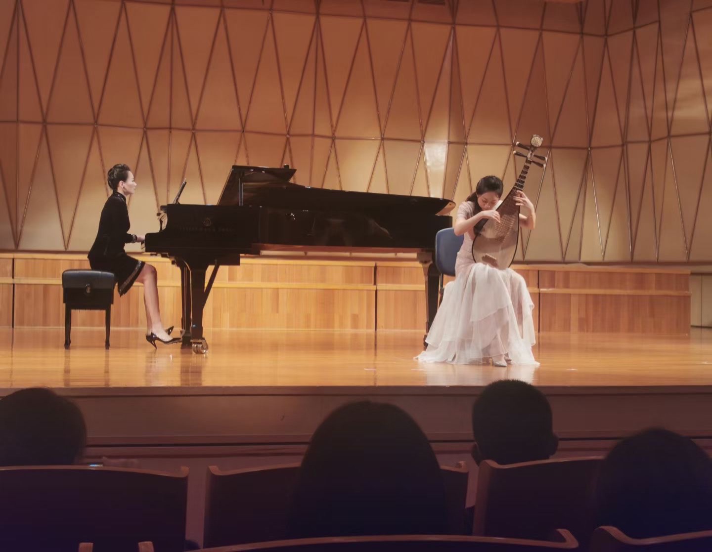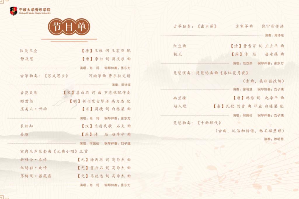 肖玛老师、张东方老师、徐明慧老师、刘子彧老师、研究生代表何佩伦以及嘉宾范双燕老师、周诗瑶老师给大家带来了多首古诗词艺术歌曲和器乐作品。如歌曲《阳关三叠》、《静夜思》、《长相知》、《元曲小唱三首》、《红豆曲》、《桃夭》,器乐作品《春江花月夜》、《苏武思乡》、《出水莲》以及《十面埋伏》。古朴而富有韵味的歌词,悠然自得的唱腔,伴随着充满激情的表演,为观众们带来一场视听盛宴。